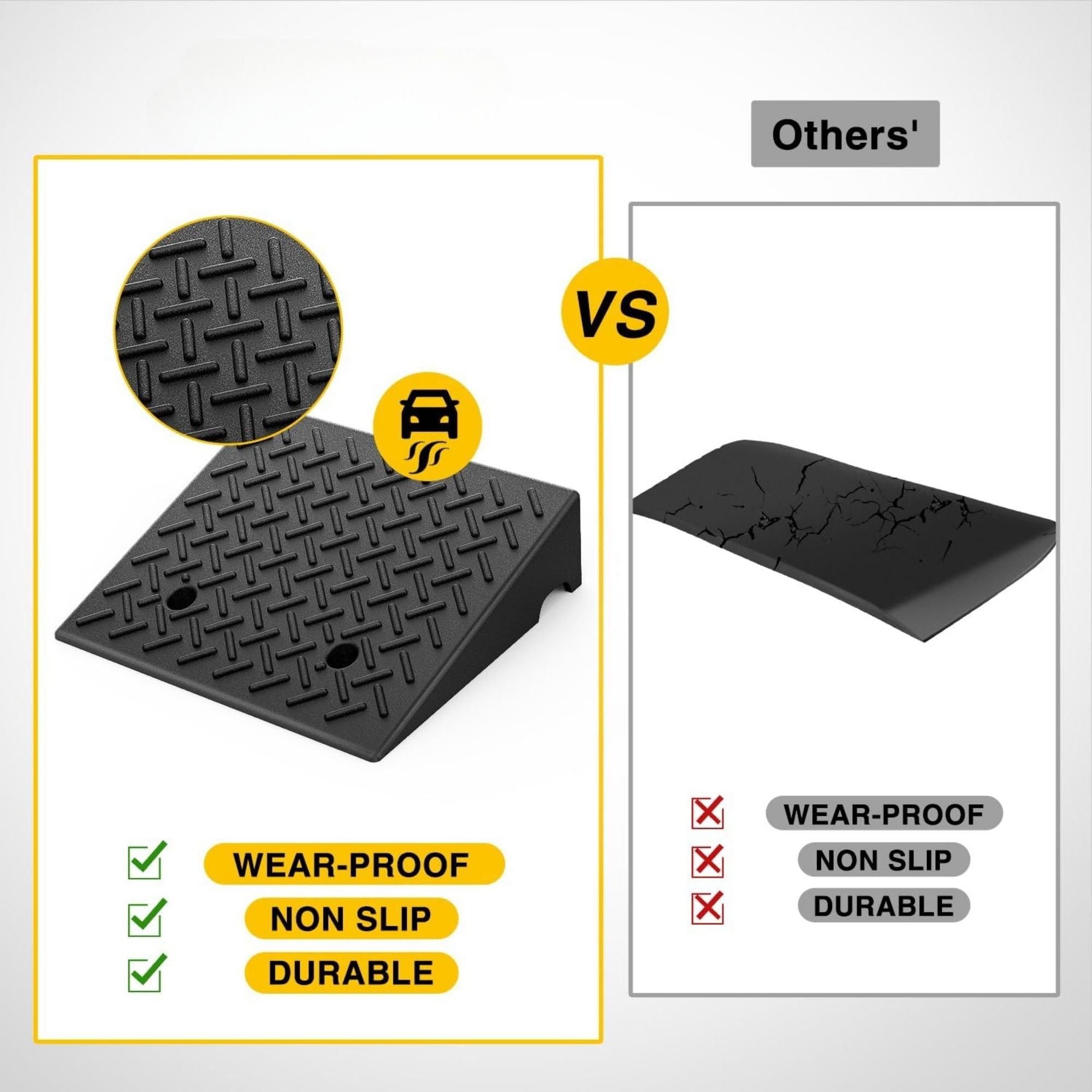 Heavy-duty Material: Constructed with industrial rubber, weight load capacity of car ramps up to 7000 lbs. This durable material is suitable for long-term use in all weather conditions.