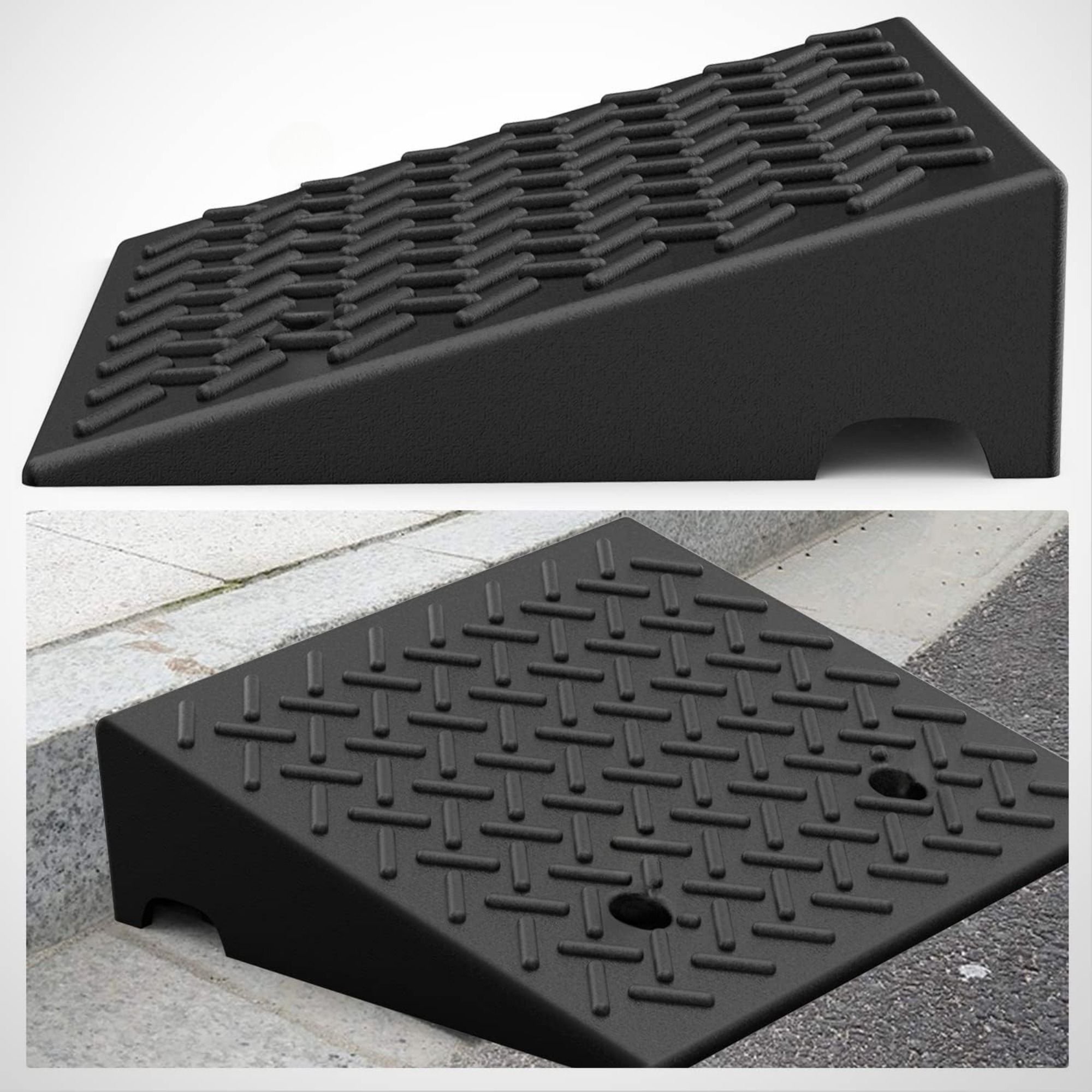Robust Grid Structure: The hollow grid at the base stabilizes the curb ramp during use and effectively eliminates the sliding effect. The water channels on both sides are designed to avoid water accumulation. The 14-degree tilt angle is lower than most rubber or plastic ramps on the market, making it more user-friendly and practical for wheelchairs and scooters.