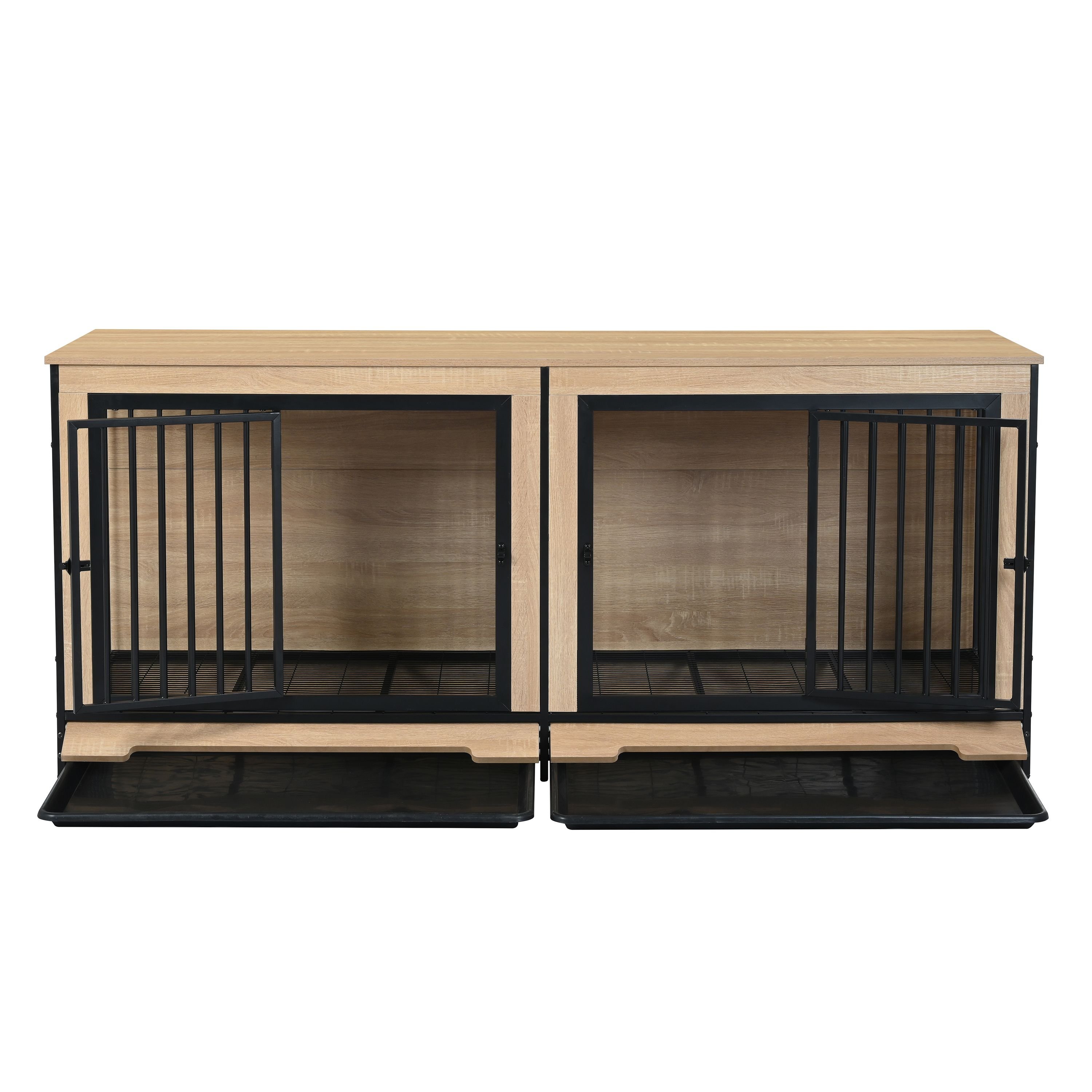 Dog Crate Furniture with Two Combined Room, XL Large Double Dog Cage Furniture with Tray for Medium Large Dogs, Wooden Dog Kennel Furniture