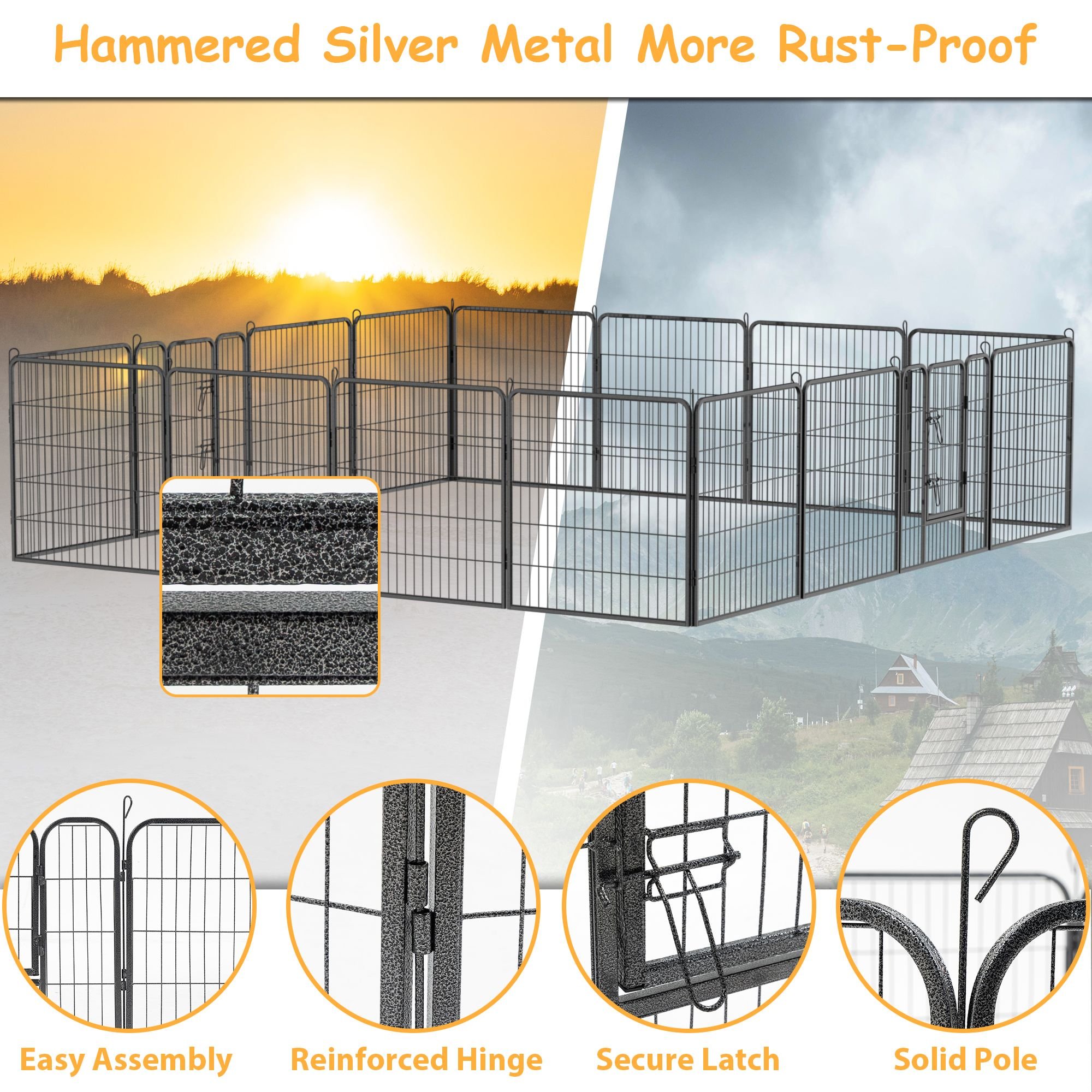 Why Do You Need A Dog Fence?Easy Pet Care:Say goodbye to such worries as pets biting furniture,messy rooms,swallowing everything or bad habits etc.Save your time and bring a win-win solution to you and your love pets. Sturdy and Firm:Our pet fence is made of heavy duty metal,which can prevent the fence from sliding due to the jumping of your pets. Safe and Secure:The edge of the dog playpen is round and smooth,providing a spacious space for pets to run, exercise and rest, and ensuring their comfort and safety.