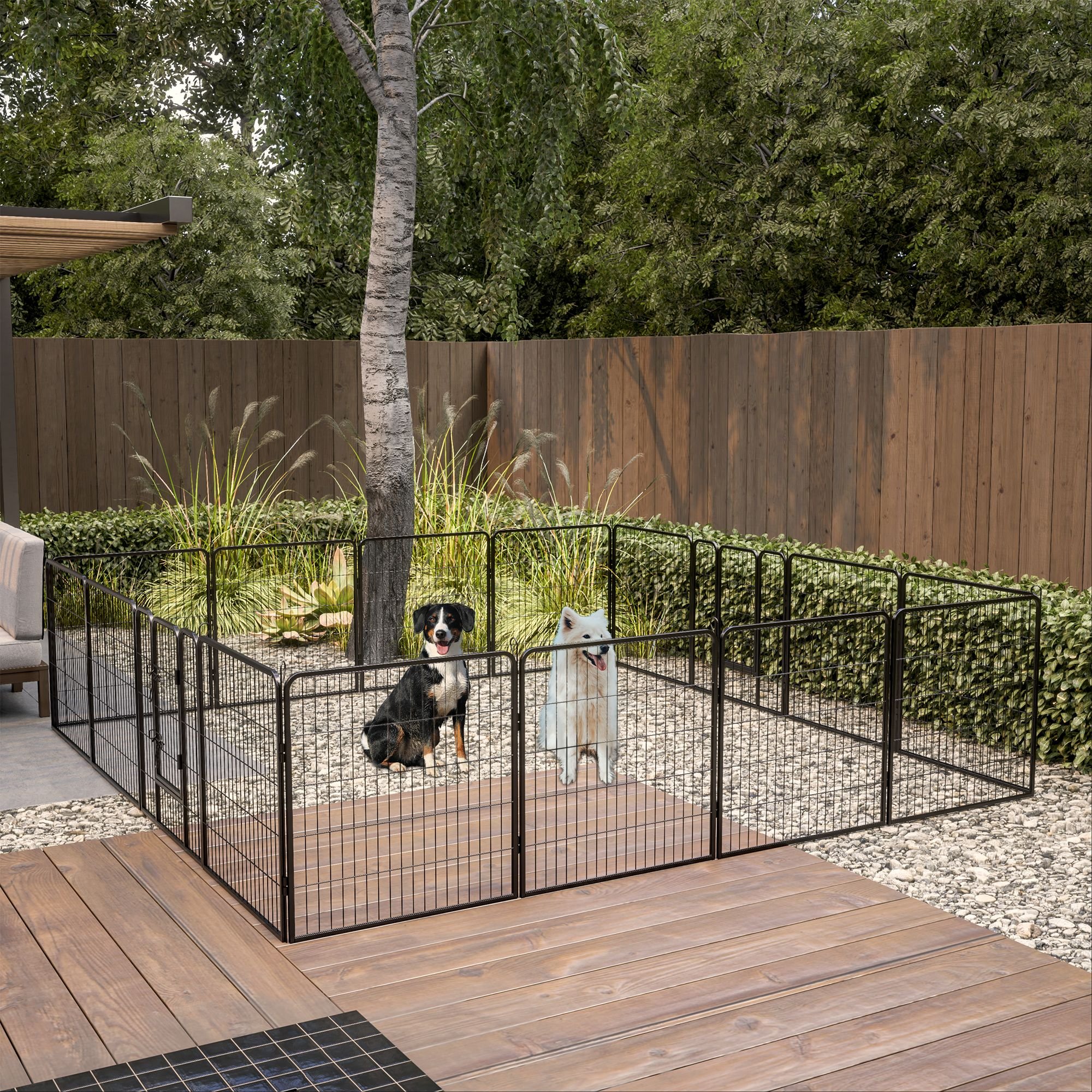 Durable & Premium Material:The dog playpen for large dogs is made of high quality wrough iron and features double-coated finish that makes it highly rust-resistant and waterproof, ideal for RV camping, traveling, or use in the yard. The dog fence with protective pads on each panel and flat stakes make it suitable to use indoor. Perfect indoor and outdoor dog play pen for resting and playing.
