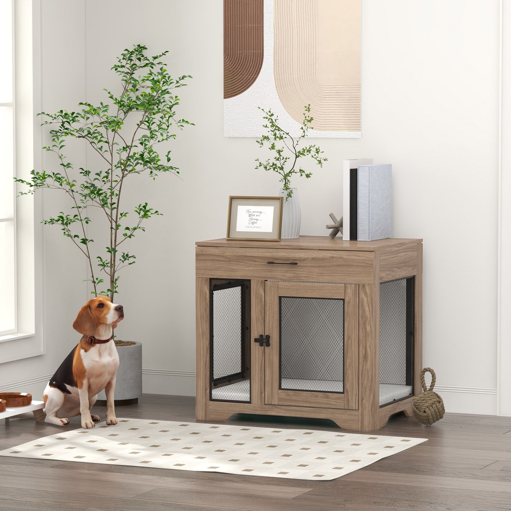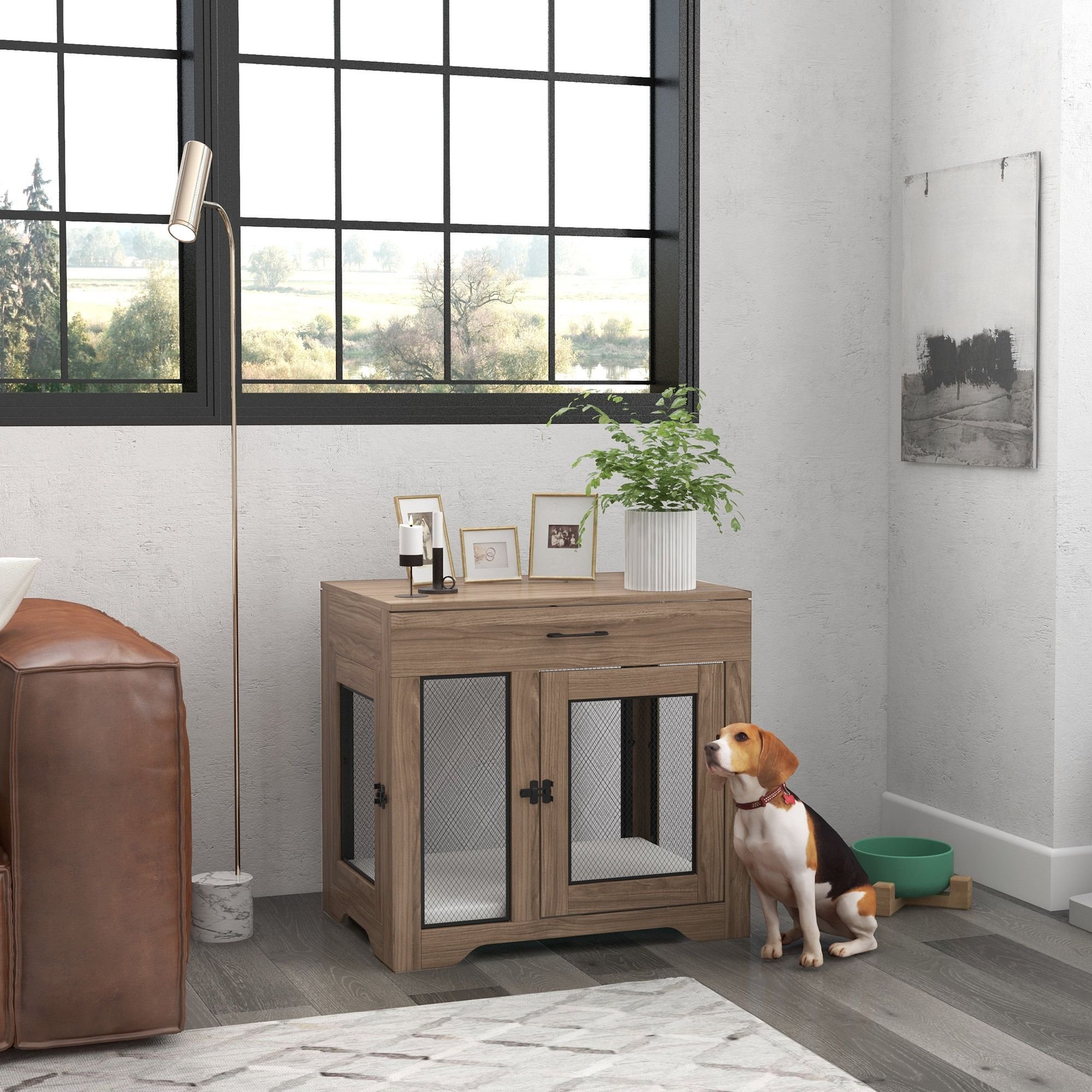 Home > PawHut Dog Crate Furniture with Soft Water-Resistant Cushion, Dog Crate End Table with Drawer, Puppy Crate for Small Dogs Indoor with 2 Doors, Brown