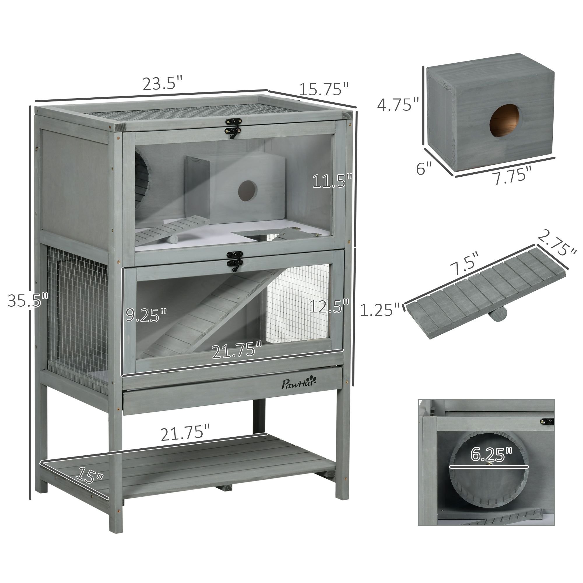 Large: With a capacity that holds a pair of two animal friends, this play cage for hamster pets provides room to run, scamper, and take off, allowing space to account for energy and exercise. Featuring toys galore, the hamster habitat contains a seesaw, wheel, ramp, and hut. Spot your little guy mid-drop of the seesaw, mid-ladder, or catching a drink of water after the fun. This hamster playhouse provides not only a large, expansive design, but activities to enjoy.