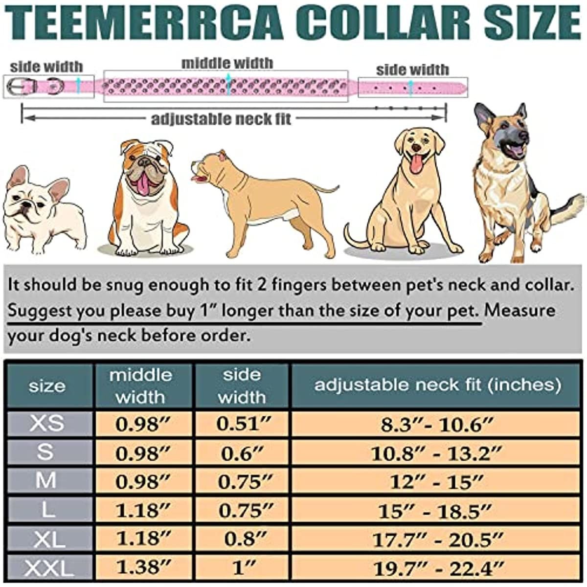 [BLACK LEATHER SPIKED COLLARS FOR MALE DOGS]Sturdy dog collar is made of soft microfiber PU leather. The D-ring which fits perfectly with almost all kinds of dog leashes; name tag. Your dog will love his new necklace and parad around showing it off. He will be a big hit! It screams bad to the bone and masculine at same time! [SPIKED DOG COLLARS]The spikes are not overly sharp; so it doesn't hurt your pet's skin and the studs don't pull dogs hair out. After wearing the studded collar; Your animals could not destroy the collar or being bitted around the neck because of the spikes. Gives them an added protection during cat/dog war play time! [ADJUSTABLE COLLARS FOR DOGS]XS: 8.3"-10.6"; S: 10.8"-13.2"; M: 12"- 15"; L: 15"-18.5"; XL: 17.7"-20.5"; XXL: 19.7"- 22.4". Suitable for puppies; small dogs; medium dogs and large dogs like Chihuahua; shih tzu; poodle; corgi; saluki; Jack russell terrier; pug; Pit bull; husky; Shiba; Boston terrier; French bulldogs; German shepherd; etc. [SURPRISED GIFT]Dog loves squeaky toys; There is a bonus squeaky ball. It's an adorable collar and ball set. Not Only an everyday collar; but also can be a "SEXY" Halloween costume. Great for using for fashion and walks. Lovely gift ready package! It's an amazing present for your or friends' dogs. [MEASURE BEFORE ORDER]There are our customers' size suggestions in the description part; please read before your order. Hope it helps. To save your time and money; kindly please measure your dog's neck carefully to make sure the correct size before your purchase; thank you.