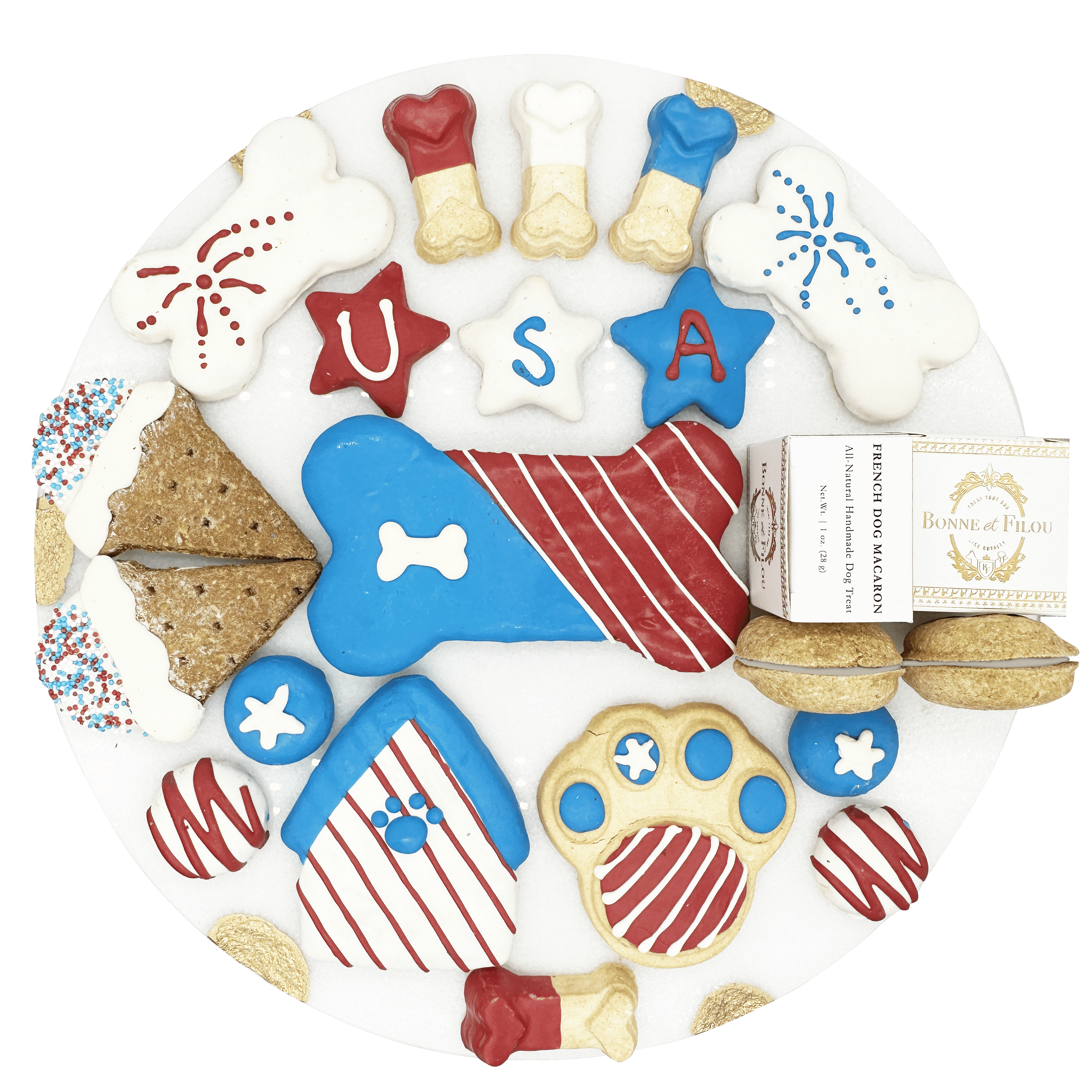 Each ornate gift box comes overflowing with a curated selection of dog-gone delicacies including sumptuous dog macarons, crunchy dog bones, round and stars shaped treats, all decorated in Red, White, Blue colors!