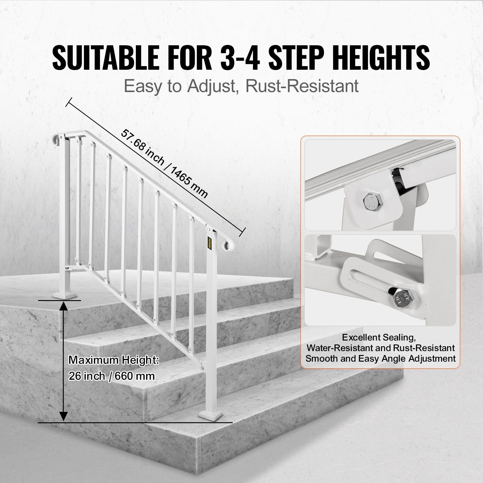 1.Flexible for 3 or 4 Steps: Max Height for Steps: 26"/66 cm; Distance Between Posts: 43.8"/111.3 cm; Upper Post Height: 38.2"/97 cm; Lower Post Height: 38.5"/97.8 cm. Due to the flexible height, our wrought iron handrail fits your 3 or 4 steps according to the different sizes. It is perfect for helping people keep balance in the rain or winter and prevent skidding.