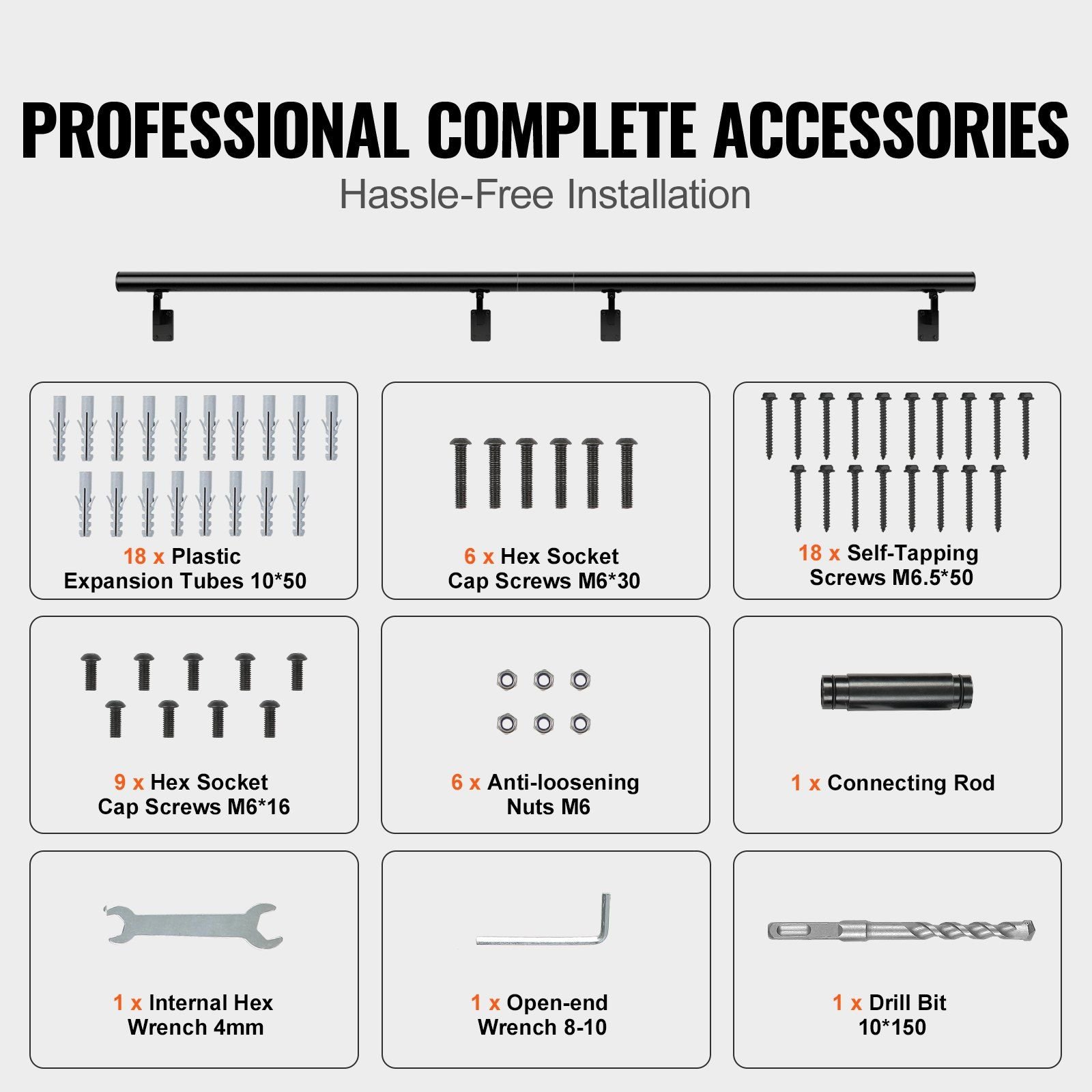 2.Comprehensive Accessories: This stair handrail comes with specialized accessories, ensuring a simple and convenient installation process. There's no need to purchase additional parts or tools. Just follow the instructions, and you can easily install the handrail, saving time and effort.