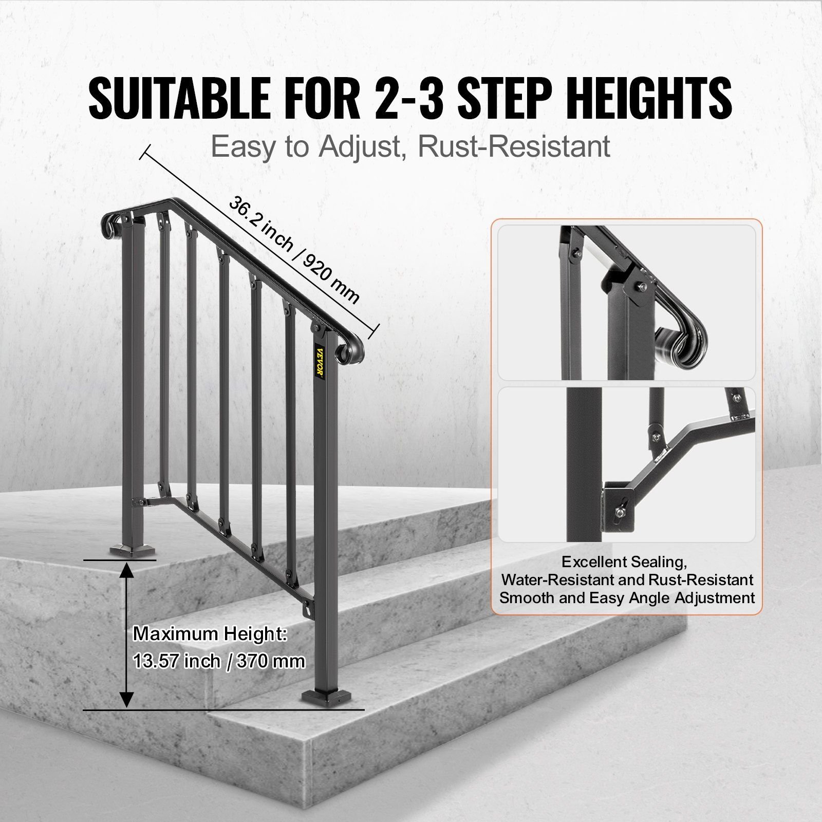 1.Flexible for 2 or 3 Steps: Max Height for Steps: 14.6"/37 cm; Distance Between Posts: 28"/71 cm; Upper Post Height: 38.2"/97 cm; Lower Post Height: 38.5"/97.8 cm. Due to the flexible height, our wrought iron handrail fits your 2 or 3 steps according to the different sizes. It is perfect for helping people keep balance in the rain or winter and prevent skidding.