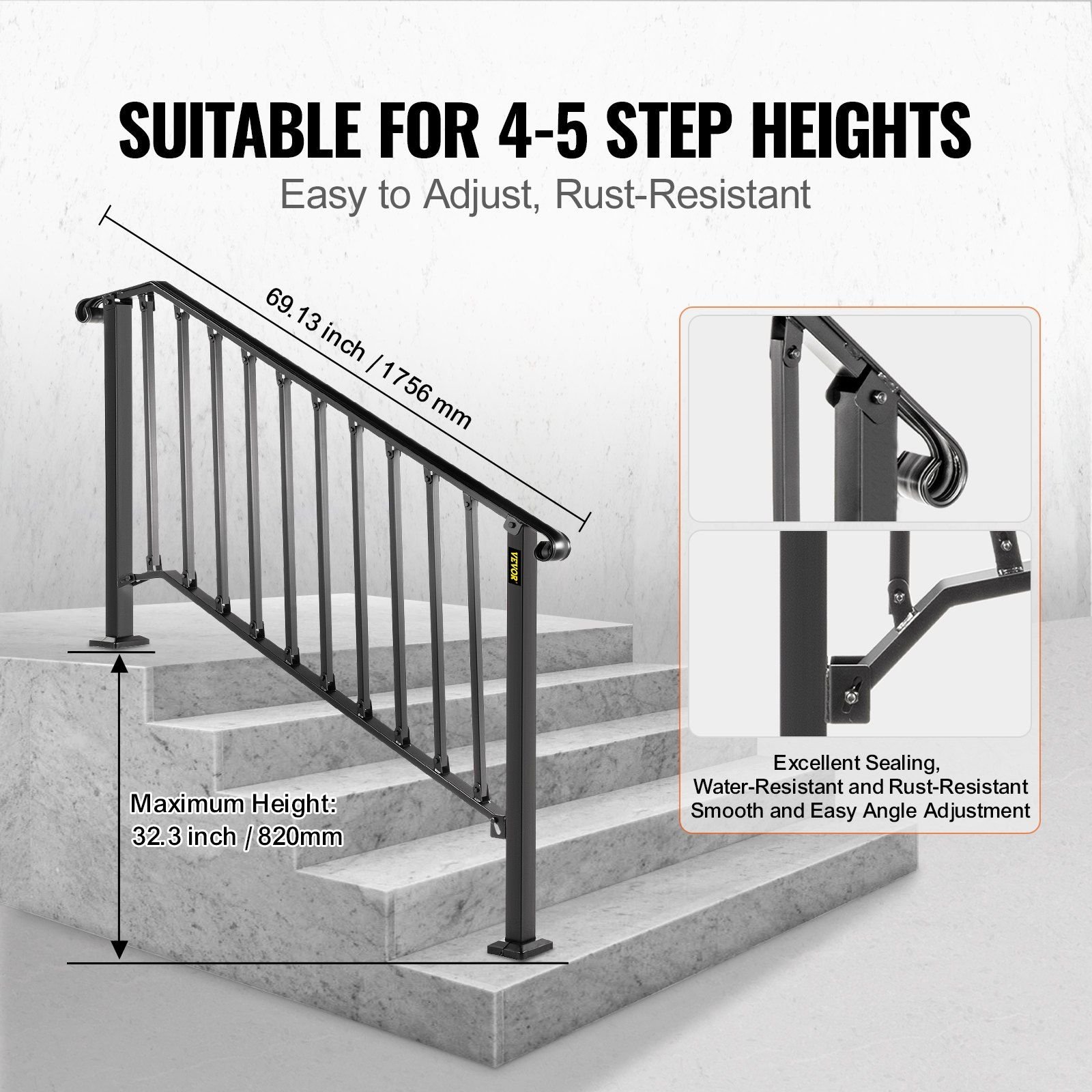 1.Flexible for 4 or 5 Steps: Max Height for Steps: 32"/82 cm; Distance Between Posts: 57"/ 144.7 cm; Upper Post Height: 38''/ 95.2 cm; Lower Post Height: 39.8''/ 99.8 cm. Due to the flexible height, our wrought iron handrail fits your 4 or 5 steps according to the different sizes. It is perfect for helping people keep balance in the rain or winter and prevent skidding.