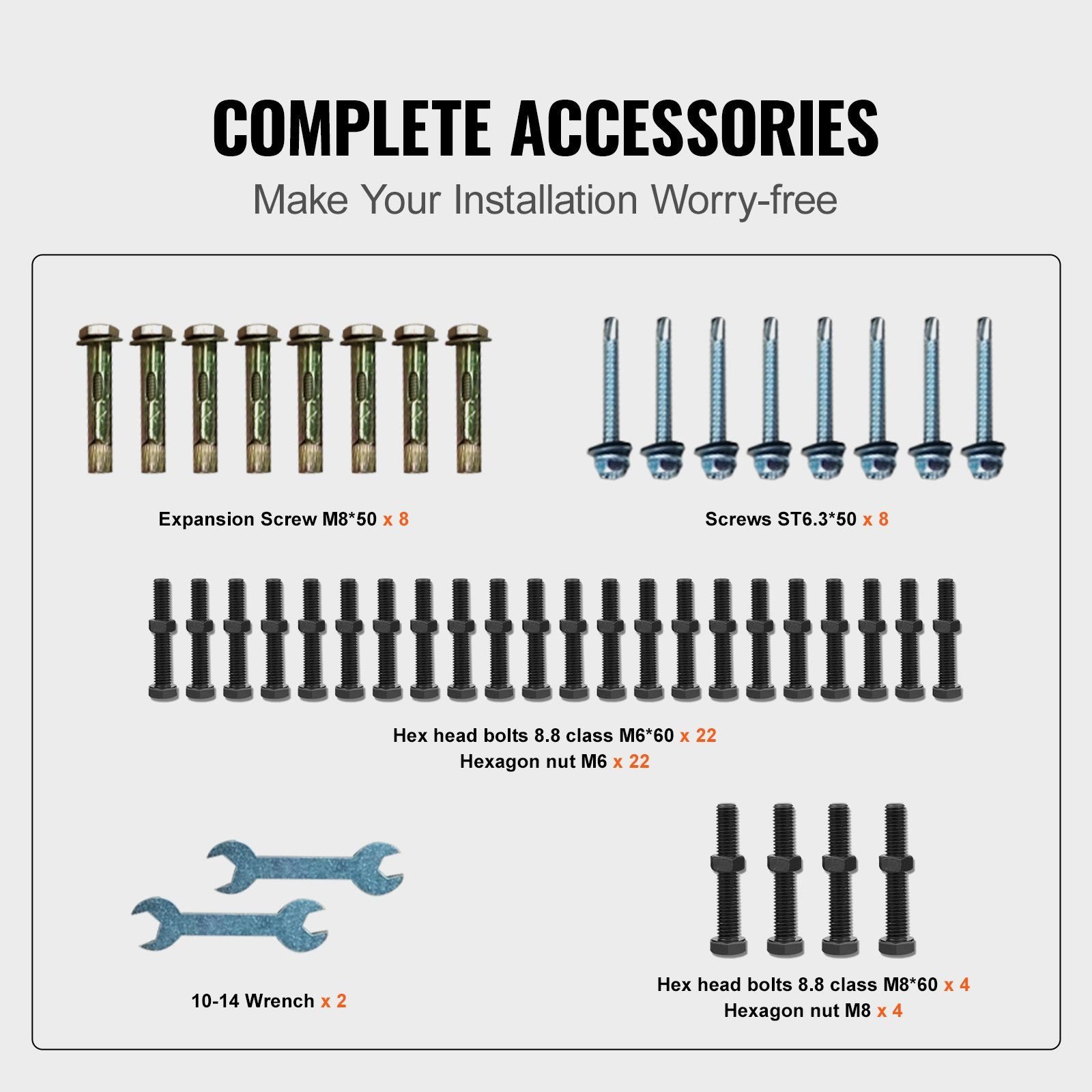 3.Effortless Installation: The front porch hand rail is easy to assemble with complete accessories, including 20 x M6 bolts, 4 x M8 bolts, 8 x self-tapping screws, 8 x expansion screws, 2 x wrenches, and 44 x gaskets. Just choose your desired location, mark it, drill holes on the mounting surface, set up screws, and finally place base trim over fasteners. It only takes a few minutes to finish the installation.