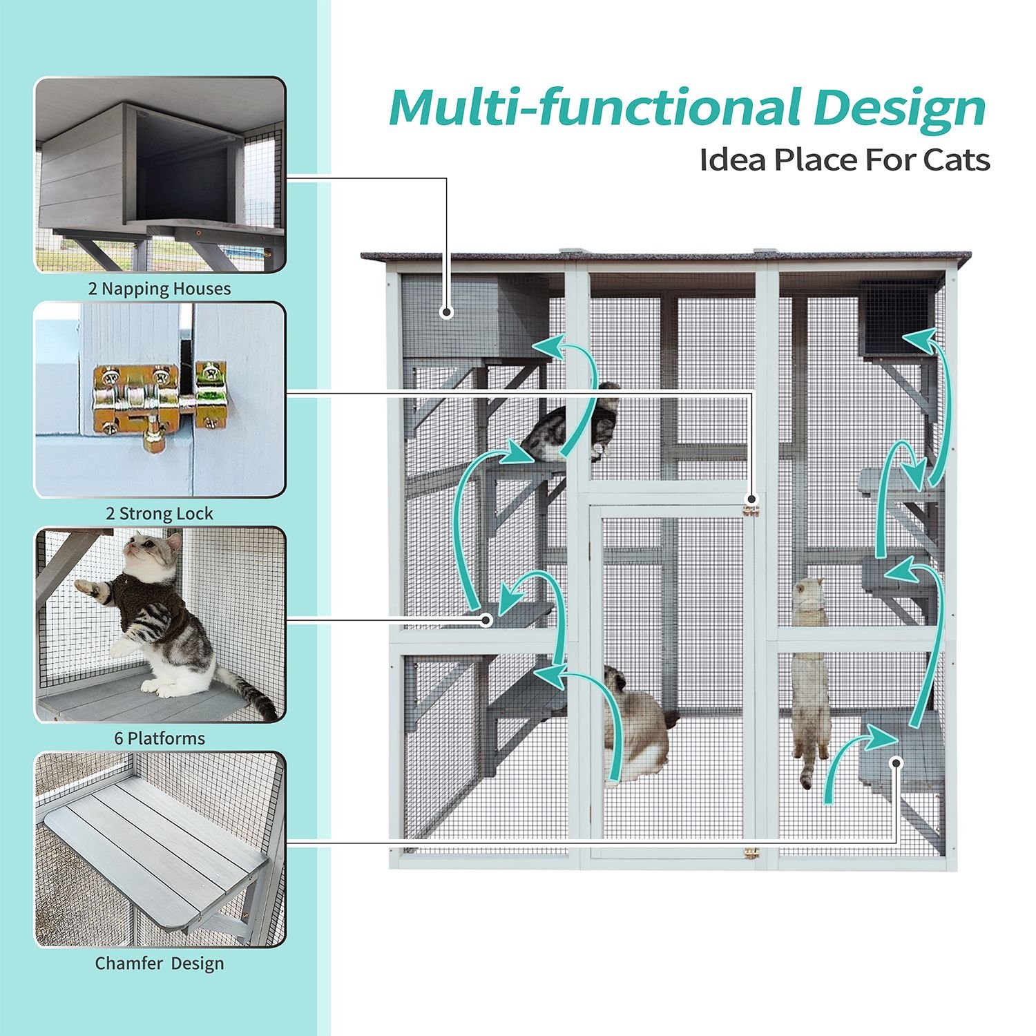 Luxury Spacious Space : The cat house features 6 large jumping platforms, 2 napping house and large bottom area, providing plenty of room for your cats to climb, jump, sleep, feed and play. Overall Dimension: 71" x 38.6" x 71" (L x W x H).